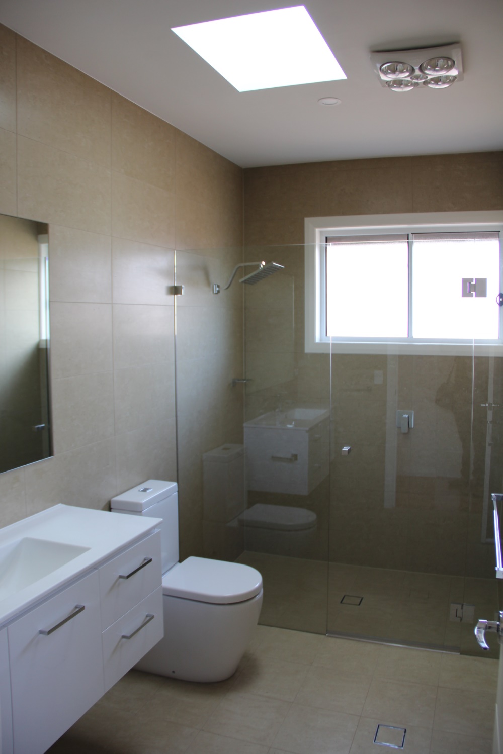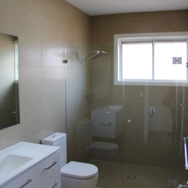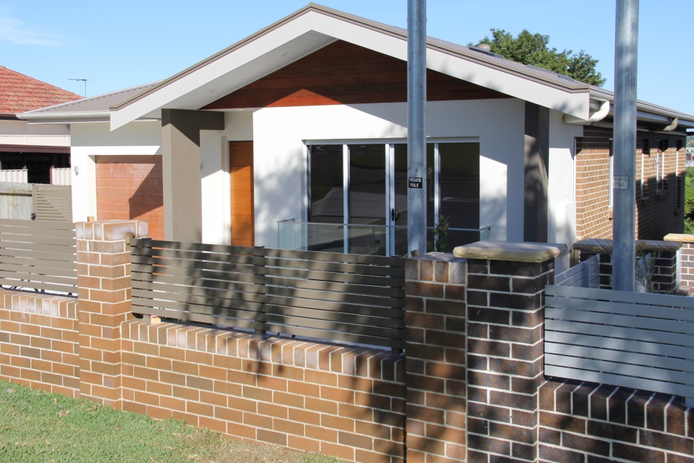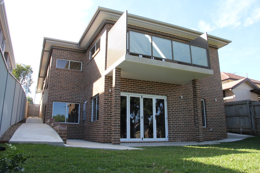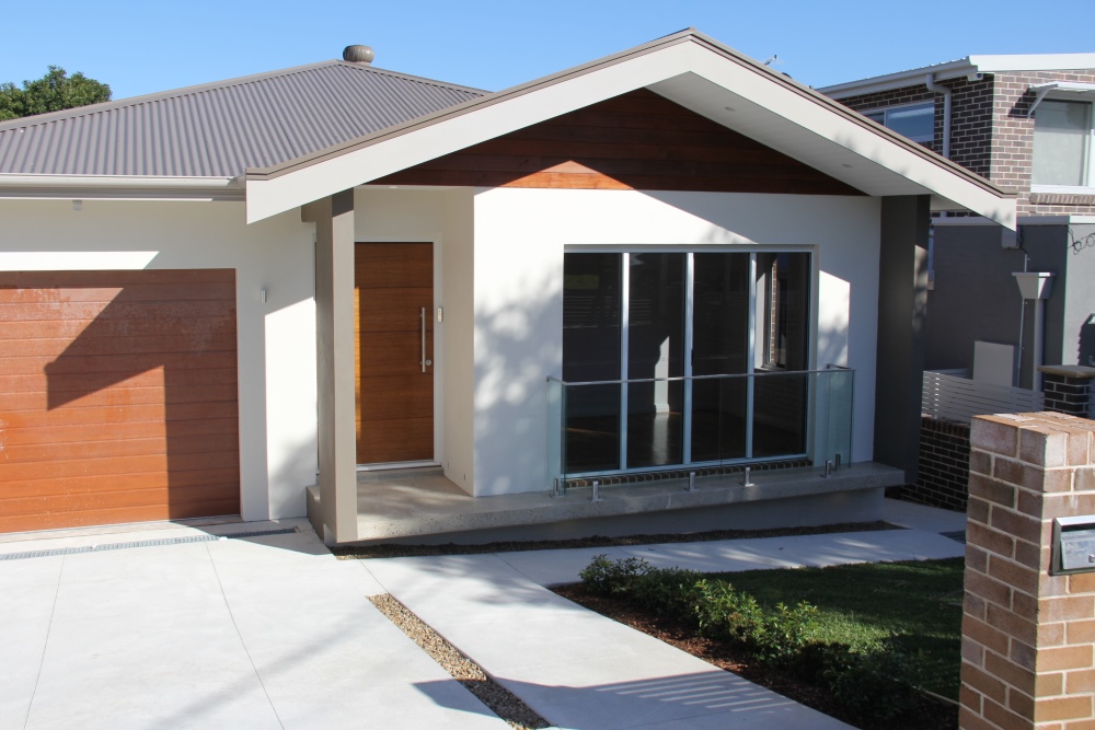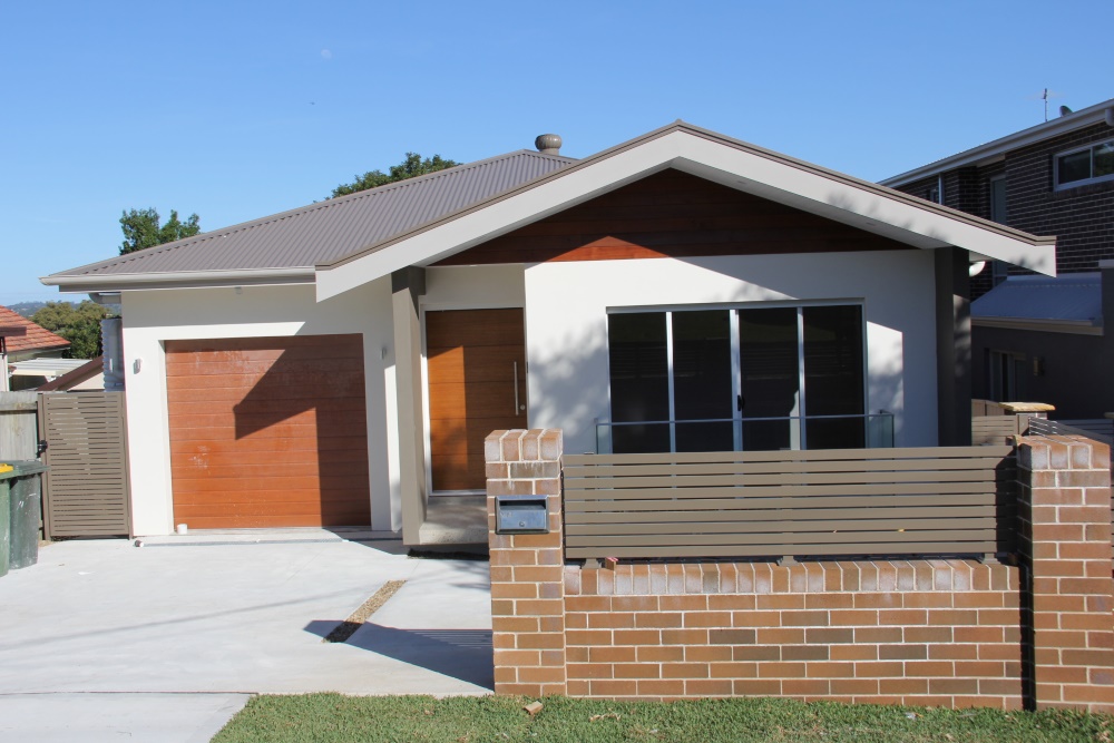 The land slopes down to the back. The design cleverly presents a single storey appearance to the street and uses the slope for a double storey section at the back.