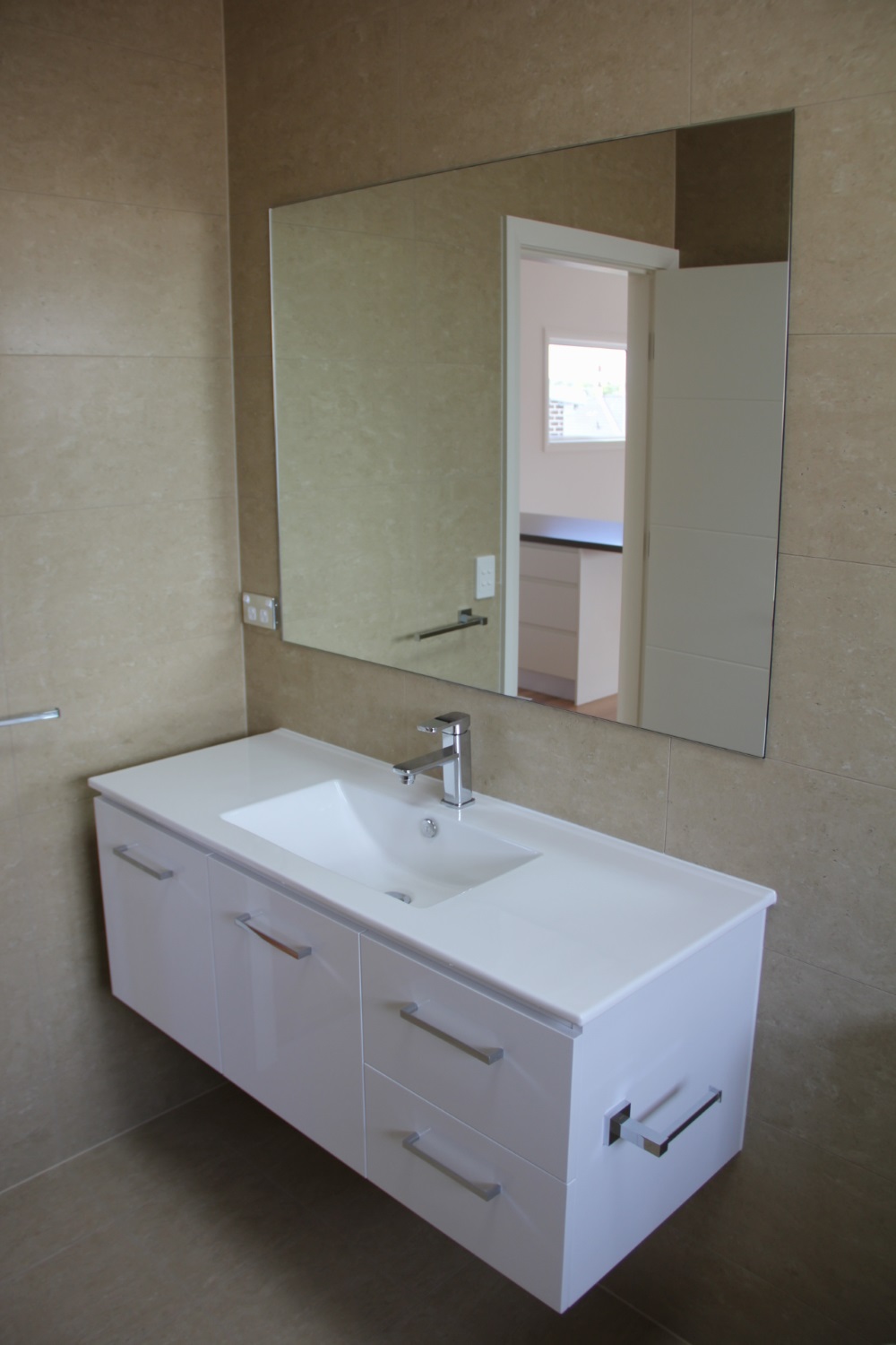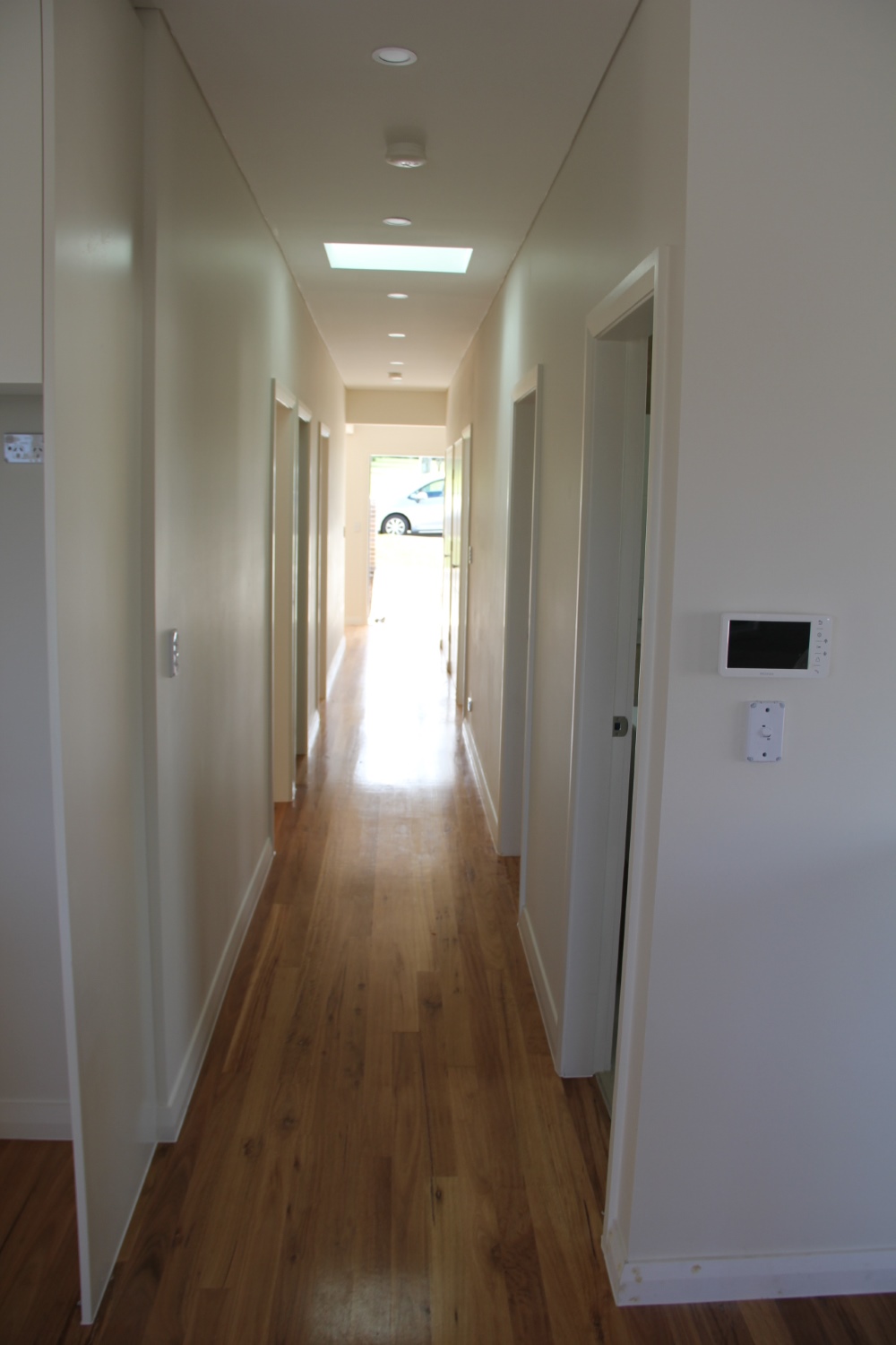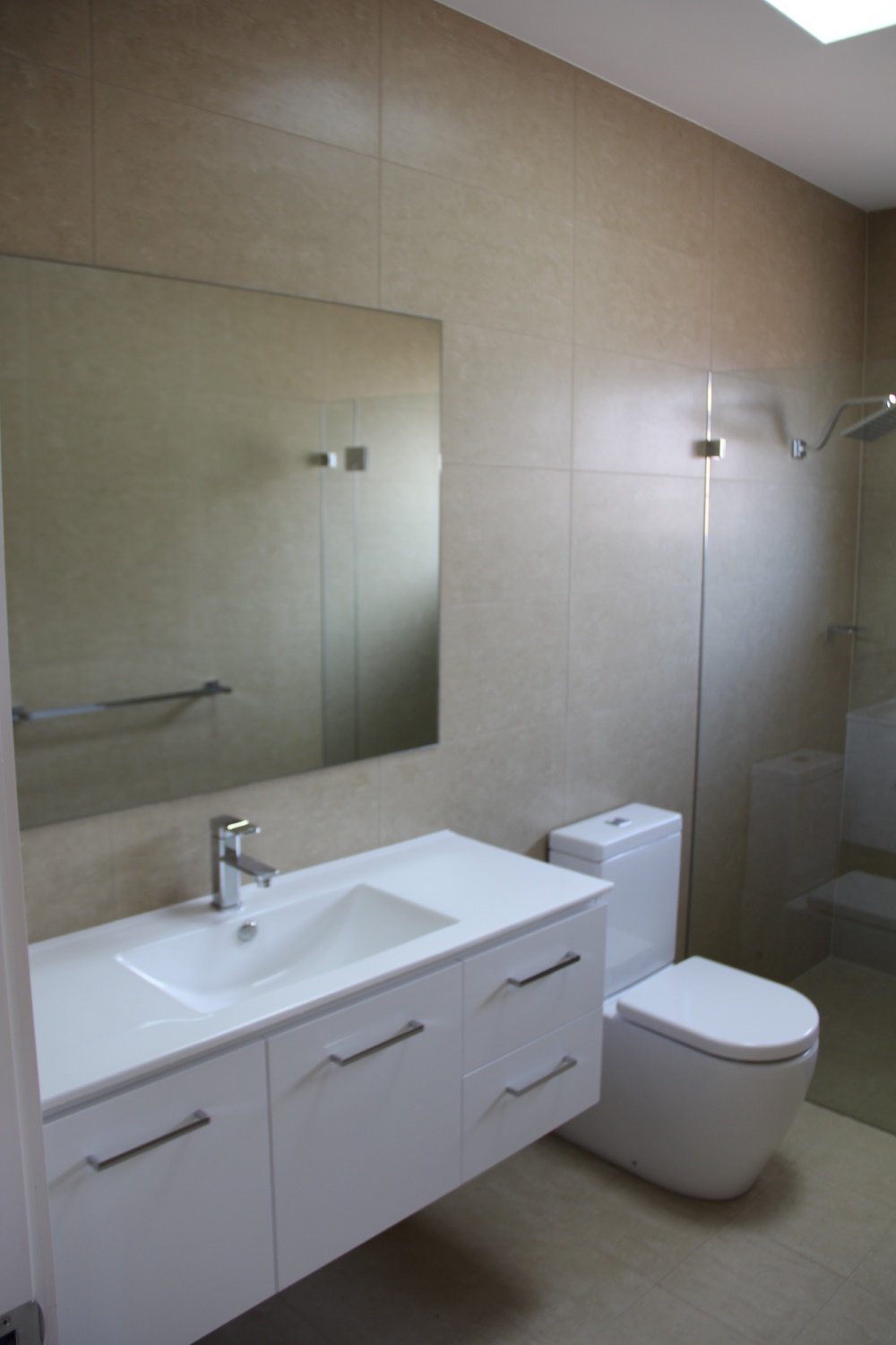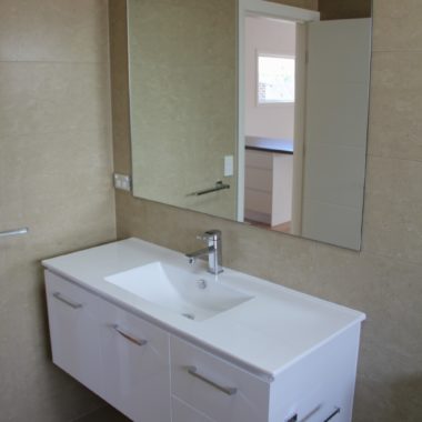 The land slopes down to the back. The design cleverly presents a single storey appearance to the street and uses the slope for a double storey section at the back.